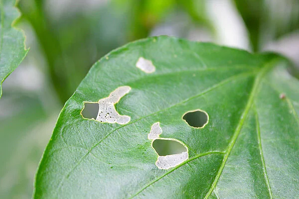 Es un pequeño escarabajo que salta como pulga y se alimenta de las hojas, causando muchos agujeros pequeños.